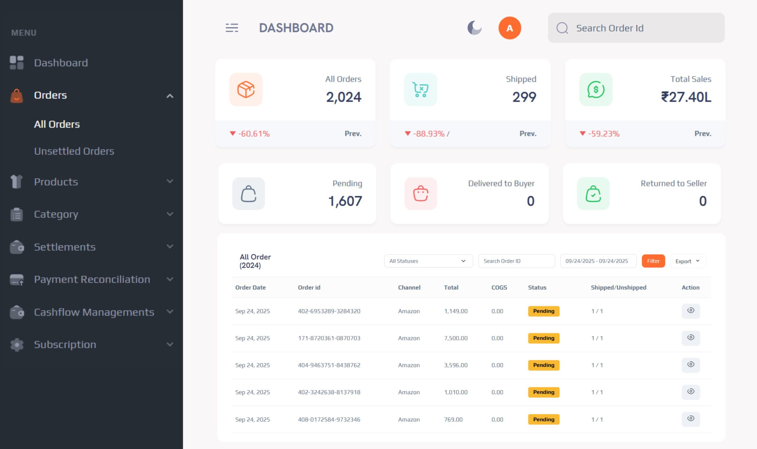 Never lose track of your Amazon payouts again. Our smart reconciliation system matches your orders, refunds, fees, and settled & unsettled payments to ensure every rupee is accounted for.
